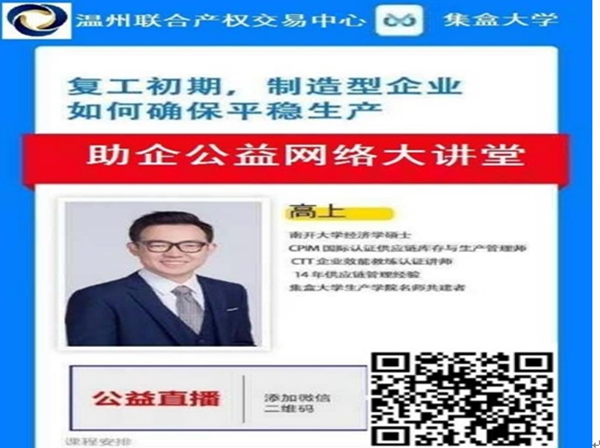 此次活動,由溫州聯(lián)合產(chǎn)權(quán)交易中心與集合大學(xué)共同發(fā)起,圍繞著在疫情下,“企業(yè)如何更好的開展供應(yīng)鏈管理工作、制造型企業(yè)如何確保平穩(wěn)生產(chǎn)、制造型企業(yè)如何降本提效之道”等三方面內(nèi)容,助力企業(yè)共克時艱。