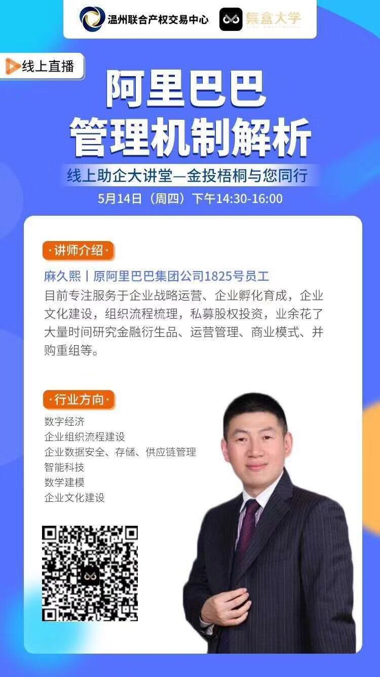 5月14日,溫州聯(lián)合產(chǎn)權(quán)交易中心順利開展了第六期暖企活動(dòng)。本次活動(dòng)特邀請(qǐng)一帶一路數(shù)字經(jīng)濟(jì)實(shí)驗(yàn)室主任麻久熙老師,以線上直播的形式,為溫州地區(qū)數(shù)百家企業(yè)進(jìn)行以“阿里巴巴管理機(jī)制解析”為主題的課程分享。