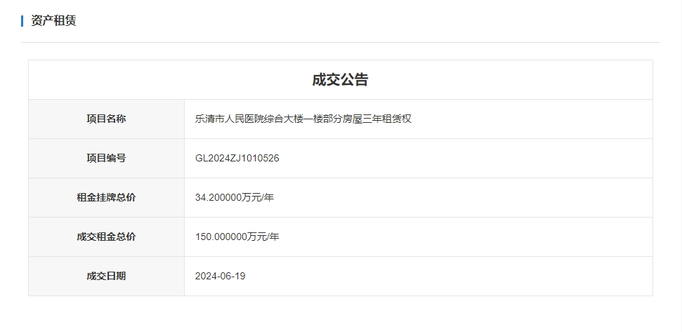 近日,受出租方委托溫州聯(lián)合產(chǎn)權(quán)交易中心有限公司掛牌的樂清市人民醫(yī)院綜合大樓一樓部分房屋三年租賃權(quán)在“浙交匯”平臺順利成交。項目以首年租金34.2萬元的價格掛牌,經(jīng)過充分競價,最終以首年租金150萬元的價格成交,溢價115.8萬元,溢價率高達338.6%。